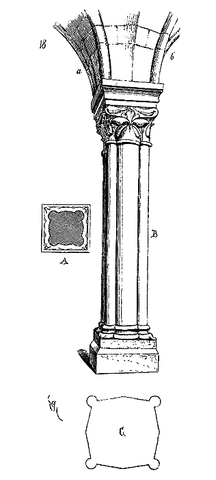 Ne perdons pas de vue les exemples précédents. Dans ces exemples, la même méthode de tracé est adoptée; l'expérience, le besoin auquel il faut satisfaire, le sentiment d'un mieux, d'une perfection absolue, guident évidemment l'artiste. Il s'agit de soumettre la matière à une forme appropriée à l'objet, en la dégageant de tout le superflu, en lui donnant l'apparence qui indique le mieux sa fonction. Les architectes ne se contentent pas encore des résultats obtenus, car l'hiératisme est l'opposé de cet art, toujours en quête de nouvelles applications, toujours cherchant, mais sans abandonner le principe créateur. Dans ces derniers exemples, la matière a été réduite déjà à son minimum de force; amoindrir encore les résistances, c'était se soumettre aux éventualités les plus désastreuses. Mais le minimum de force obtenu, il s'agit de donner à ces membres une apparence plus légère, sans inquiéter le regard. Les architectes ont observé que les nerfs saillants ajoutés aux boudins, donnent à ceux-ci une apparence de fermeté, de résistance qui, loin de détruire l'effet de légèreté, l'augmente encore. Ils observent que les corps soumis à une pression, comme les arcs de pierre, résistent en raison, non de leur surface réelle, mais de la figure donnée à cette surface. Le principe que nos ingénieurs modernes ont appliqué avec l'exacte connaissance des lois de résistance des corps, à la fonte de fer, par exemple, les architectes du moyen âge cherchent à l'appliquer à la pierre, mais en tenant compte des qualités propres à cette matière, qui est loin d'avoir la force de cohésion du métal.