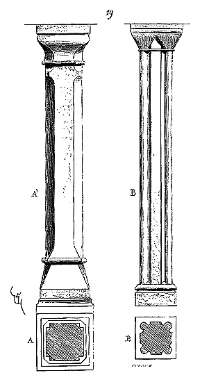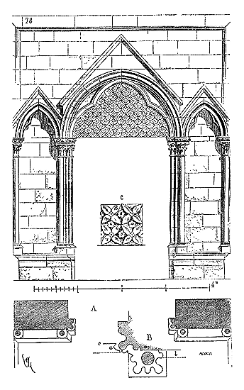 Si les puits placés extérieurement sur la voie publique étaient d'une grande simplicité, ceux qui s'ouvraient dans les églises où les cloîtres étaient souvent très-richement ornés. Leurs margelles, les supports des poulies, devenaient un motif de décoration. Il existait autrefois, dans le bas côté sud de la cathédrale de Strasbourg, un puits très-riche, taillé dans de la pierre de grès. Sa margelle était tracée sur plan hexagonal. Sur trois des faces, s'élevaient trois piles qui supportaient trois linteaux se réunissant au centre de l'hexagone (voy. le plan A, fig. 4), et soutenant, à leur point de jonction, la poulie attachée à un cul-de-lampe. Les trois linteaux étaient ornés d'arcs avec roses et redents. Une corniche couronnait ces linteaux (voy. l'élévation B).