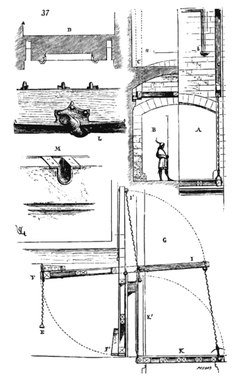 Les constructeurs du moyen âge ne procédaient pas autrement que nous pour percer des puits. Creusant un trou cylindrique, ils y plaçaient un rouet de bois de chêne, sur lequel on élevait le mur en tour ronde. Déblayant peu à peu sous le rouet, celui-ci descendait avec la portion de maçonnerie qu'il supportait; on complétait, à mesure de l'abaissement du rouet, cette maçonnerie cylindrique dans la partie supérieure.