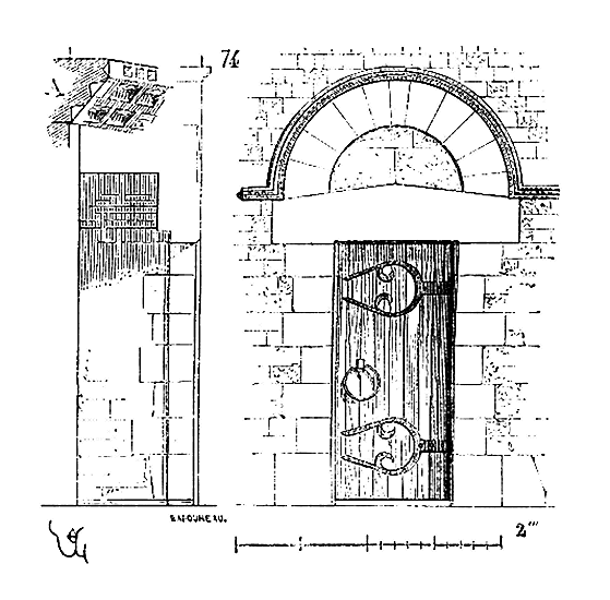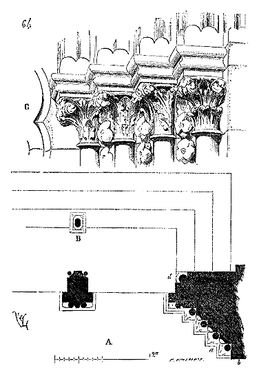 La margelle reposait sur une marche C entourée d'un caniveau saillant D, pour éviter que l'eau échappée des seaux ne se répandît sur le pavé de l'église 380. Ce puits datait du XIVe siècle, et ne fut enlevé que pendant le dernier siècle.