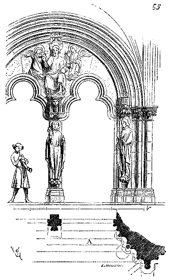 Mais, dans une autre partie de cet ouvrage 375, nous avons fait ressortir des dissemblances non moins grandes entre les architectures antique et du moyen âge; nous avons fait voir que si les architectes de la Grèce et de Rome soumettaient les parties de leurs édifices au module, c'est-à-dire à un système de proportions dépendant de l'art seul, les architectes du moyen âge avaient tenu compte de l'échelle humaine, c'est-à-dire de la dimension de l'homme. C'est là un point capital et qui dut nécessairement établir dans le mode des proportions un élément nouveau. En effet, les bases, les chapiteaux, les diamètres de colonnes, les profils et les bandeaux, les baies, les appuis, devraient nécessairement, d'après la donnée des artistes du moyen âge, tout d'abord, et quelle que fût la dimension de l'édifice, rappeler la taille humaine. C'était un moyen de présenter aux yeux la dimension vraie d'un monument, puisqu'on établissait ainsi dans toutes les parties un rapport exact avec l'homme 376. Nous admirons autant que personne les principes de proportions qui régissent l'architecture grecque, mais nous ne pensons pas que ces principes soient les seuls admissibles; nous sommes bien forcés de reconnaître l'existence d'un nouveau mode de procéder chez les maîtres du moyen âge, et, en l'étudiant, nous ne saurions en méconnaître l'importance. Les Grecs admettaient la puissance des nombres: c'était, pour ainsi dire, chez eux un principe religieux. Les nombres impairs et leurs multiples dominent, 3, 9, 7, 21, 49; mais ils ne tiennent compte de l'échelle humaine; ils établissent une harmonie parfaite à l'aide de ces combinaisons de nombres. Cela est admirable sans contredit, et mériterait même une étude plus attentive de la part de ceux qui prétendent posséder le monopole des connaissances de cet art (bien qu'ils se contentent d'en étudier sans cesse les produits, sans jamais en déduire un système philosophique, dirons-nous); mais, à côté ou à la suite de cette méthode arithmétique si intéressante, il y a la méthode géométrique du moyen âge, et l'intervention de l'échelle humaine, qui sont d'une certaine valeur et qu'on ne saurait dédaigner.