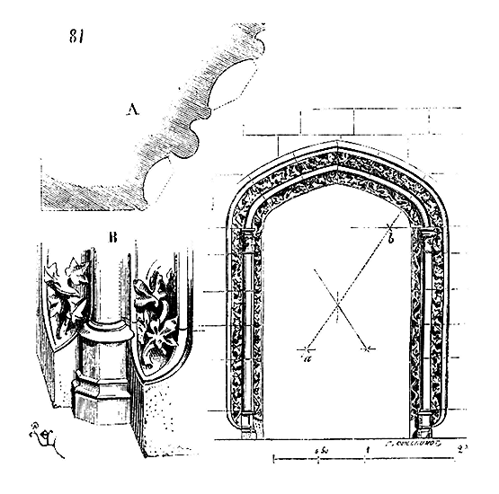 Aussi les voyons-nous (fig. 25) adopter des profils d'arcs dans lesquels les membres, moins détachés de la masse, acquièrent cependant une apparence d'extrême délicatesse. La méthode pour tracer ces arcs est la même que celle admise dans les exemples derniers. La surface aa', bc (voy. le profil d'arc-doubleau A) est la surface de résistance minimum, les deux lignes ac, a'b étant à 60º. Aucun évidement ne vient entamer cette surface, mais les membres supplémentaires, les boudins nervés, donnent du roide au claveau et s'opposent à sa déviation. Bien que larges, les cavets laissent de fortes attaches aux boudins, et ceux-ci prennent une apparence à la fois plus légère et plus ferme par l'adjonction des nerfs saillants très-prononcés. Le tracé A, après toutes nos définitions précédentes, n'a pas besoin d'être décrit.