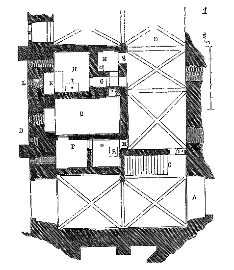 Les bâtiments de la chambre des comptes, commencés par Louis XI et achevés par Louis XII, étaient en M. En N était une poterne avec tournelles, dont nous avons encore vu des restes intéressants il y a quatre ans. Cette poterne et l'enceinte O, avec quais, dataient du XIVe siècle. Quant à l'enceinte E', ses traces étaient visibles dans des maisons particulières avant la construction du bâtiment actuel de la police correctionnelle, ainsi que le constate un plan relevé avec le plus grand soin par M. Berty, et accompagné de renseignements bien précieux 8. En P était une chapelle placée sous le vocable de saint Michel, en R le pont aux Changeurs, et en S le pont aux Meuniers, ou le Grand-Pont. En T le jardin, les treilles du roi, séparé d'une petite île (île aux Vaches) par un bras de la Seine. Là était le bâtiment des étuves. De ce vaste ensemble de logis et monuments, il reste encore aujourd'hui: la sainte Chapelle, privée seulement de son annexe V à trois étages, servant de sacristie et de trésor des chartes; le rez-de-chaussée de la grand'salle, tel que le donne notre plan; une partie notable des portiques K; la partie intérieure du bâtiment des cuisines et de la salle B, ainsi que les quatre tours sur le quai de l'Horloge; le logis L dans toute sa hauteur. C'était dans la cour X qu'était planté le May. Cette réunion de monuments, tous d'une bonne architecture, présentait au centre de la Cité l'aspect le plus saisissant.