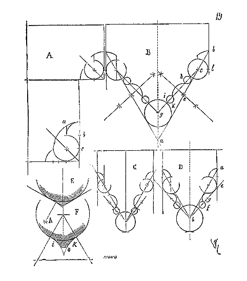 C'est toujours par des sections de lignes à 60º, 45º et 30º que les centres sont obtenus. On voudra bien jeter les yeux sur le tracé B d'un boudin inférieur et sur la manière de trouver les centres des contre-courbes du nerf, les lignes ef étant à 60º. Mais les boudins inférieurs, d'un diamètre plus fort que les autres, présentent latéralement des surfaces molles en regard des autres boudins nervés d'un diamètre plus faible. Alors on prétend aussi nerver latéralement ces gros boudins inférieurs (voy. en C); on leur donne ainsi plus de résistance, et on les fait paraître plus détachés et plus légers; cependant la courbe originaire se voit encore en ij, comme pour ne pas laisser périr le principe de tracé. Ces nerfs latéraux donnent une apparence trop prismatique à ces boudins inférieurs: on y renonce promptement, et on relève le nerf latéral sur un axe à 30º (voy. l'exemple D en k). Alors la forme génératrice du boudin inférieur reparaît moins altérée, et c'est à ce parti que les architectes s'arrêtent au commencement du XVe siècle.