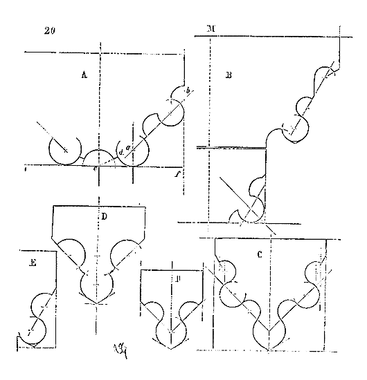 Ainsi sommes-nous arrivés, par une suite de transitions presque insensibles et toutes dérivées d'une méthode uniforme, des exemples donnés figures 18 et 19 à celui-ci; et cependant, si l'on ne tenait compte des intermédiaires, il serait difficile d'admettre que le dernier de ces profils n'est qu'une déduction des premiers.