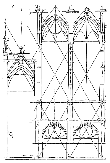 Ailleurs 371 nous avons expliqué comment les proportions des cathédrales de Paris et d'Amiens avaient été établies à l'aide des triangles égyptien et équilatéral. En effet, le triangle isocèle rectangle est rarement admis comme principe de proportions dans les édifices de la période gothique; le triangle dont la base contient quatre parties, et la verticale élevée du milieu de cette base au sommet, deux parties et demie (triangle égyptien), et le triangle équilatéral, deviennent dorénavant les générateurs des proportions.
