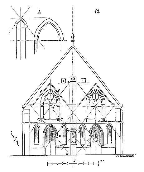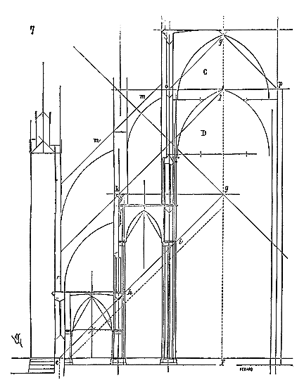 En A, est tracée une travée du plan du rez-de-chaussée; en B, une travée du plan du premier étage. Au premier étage, la projection horizontale des voûtes est obtenue au moyen du triangle équilatéral abc, le sommet c donnant le centre de la clef de la voûte; les nervures des arcs ogives sont projetées suivant les lignes bc, ac, la base ab étant le nu intérieur. Le niveau d du banc intérieur (voy. la coupe transversale) est la base de l'opération. Le nu intérieur étant la verticale e (c'est l'axe des colonnettes de l'arcature), le triangle équilatéral efg a été élevé sur la base, dont eh est la moitié. Les côtés de ce triangle équilatéral ont été prolongés indéfiniment. La ligne horizontale ik étant donnée comme le niveau de l'appui des grandes fenêtres, sur la base ik égale à he a été élevé le second triangle équilatéral, dont l est le sommet. Ce sommet a donné la hauteur des naissances de la voûte. Le côté gf prolongé a donné en m les clefs des arcs des fenêtres. Pour la chapelle basse, les axes des colonnes isolées se trouvent élevés aux deux extrémités de la base du triangle équilatéral dont no est un des côtés. Du niveau p (naissance des voûtes basses) et de l'axe des colonnes, la rencontre de la ligne pq avec le prolongement du côté fe a donné la clef des fenêtres de la chapelle basse. Les côtés fm prolongés ont servi à poser les pinacles supérieurs. La pente rs du comble est également tracée suivant un angle de 60º. Ainsi, pour la coupe transversale comme pour le plan du premier étage, les triangles équilatéraux ont été les générateurs des proportions.