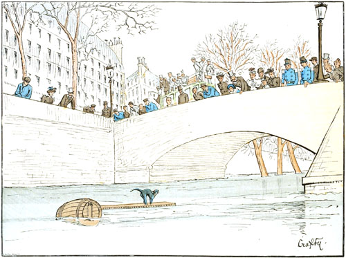 Une crue un peu forte s'est produite pendant la nuit, et le fleuve a recueilli un certain nombre d'objets imprudemment déposés trop près de ses rives, poutres, futailles vides, et autres matériaux susceptibles de flotter. Sur une de ces épaves un chat miaule déplorablement, et tous les cœurs sensibles, affiliés ou non à la Société protectrice des animaux, se demandent avec angoisse quel courageux sauveteur se portera au secours de l'infortuné félin.
