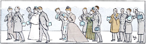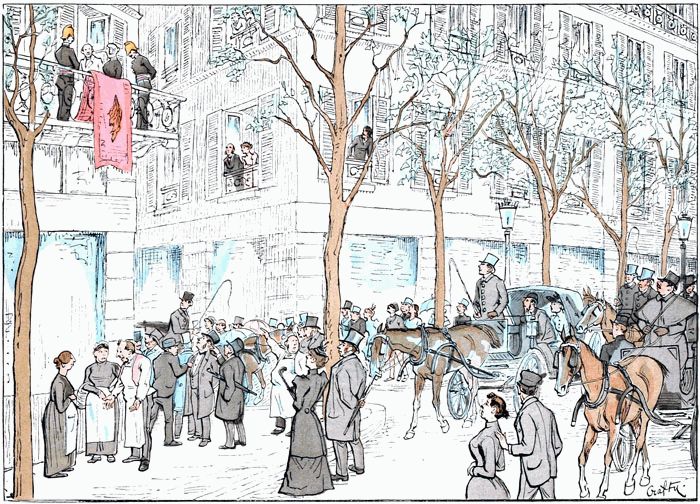 La foule est généralement sympathique aux mariages. L'heure à laquelle ils s'accomplissent coïncide généralement avec celle du déjeuner des modistes et autres couturières du quartier, que leur manque de dot maintient à l'état de célibataires sans leur enlever le désir et l'espérance de monter en grade. Elles constituent le fonds des spectateurs, et leurs connaissances spéciales leur permettent d'estimer avec exactitude les ressources probables des nouveaux conjoints et de leur entourage.