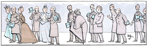 C'est toujours au moment où le défilé des voitures est le plus actif, où les chevaux sont le plus animés, que l'autorité spéciale intervient et exige qu'on les arrête pour laisser passer le public de la Pelouse. Si les chevaux s'impatientent de façon à rendre la station inquiétante, s'ils pointent au point de faire craindre qu'ils se renversent sur les genoux de leurs conducteurs, on peut être sûr que ladite autorité abusera de son pouvoir discrétionnaire pour faire défiler une nouvelle escouade de piétons.