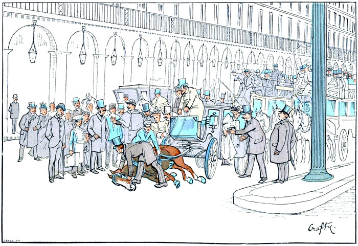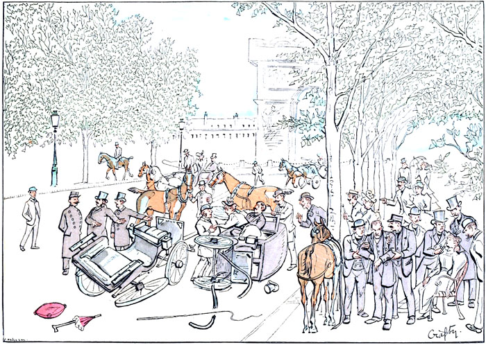 Le choc attendu s'est produit. Un fiacre négligemment conduit, cela s'est vu, débouchant de la rue de Presbourg, n'a pas eu le temps d'éviter l'avalanche à quatre roues qui roulait vers lui. La roue de derrière du char emporté (elle s'est rompue du coup) a heurté la sienne de telle sorte que les deux véhicules se sont trouvés instantanément arrêtés. Le fiacre, plus léger, a été précipité sur le côté, pendant que son cocher a été lancé sur la contre-allée. Des âmes charitables s'occupent d'extirper des flancs de la boîte endommagée ses infortunés habitants.—Un médecin, il s'en trouve toujours dans ces cas-là, prodigue ses soins à la propriétaire de la victoria, qu'on a transportée sur une chaise Tronchon. Pendant ce temps son compagnon cherche à égarer la religion du représentant de l'autorité en lui faisant de l'accident un récit singulièrement inexact, tendant à rejeter sur le cocher du fiacre, rendu muet par de nombreuses contusions, toute la responsabilité de la rencontre et de ses suites.