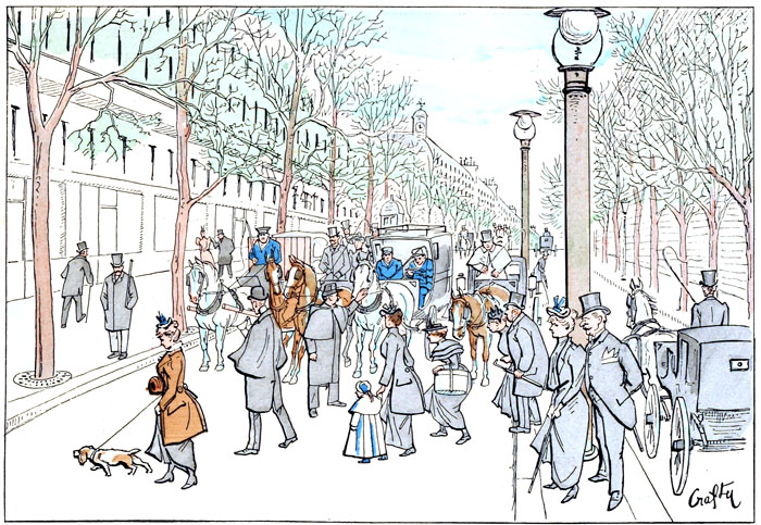 Il est midi. C'est l'heure des déjeuners, et, comme la Réclame sait que ventre affamé n'a pas plus d'yeux que d'oreilles, elle se repose. Les véhicules enluminés stationnent alignés au bas des trottoirs, pendant que leurs attelages étirent leurs membres fatigués et allument la réconfortante cigarette.—Pour être immobiles, ces véhicules n'en conservent pas moins leur aspect hétéroclite pour tous, terrifiant pour les quadrupèdes, et comme leur station quotidienne coïncide avec la rentrée des manèges, elle met au désespoir les écuyers chargés de veiller sur les premiers pas des jeunes amazones, dont les montures consternées manifestent de diverses manières leur invincible répugnance.