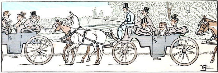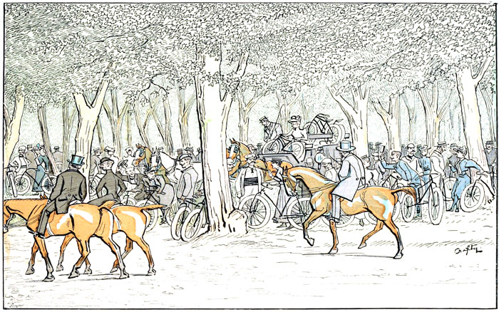 Toute aux bicyclettes.—L'accumulation de ces mécaniques donne à l'élégant carrefour l'aspect d'une gare de marchandises ou d'une exposition de machines agricoles,—les gens qui viennent en voiture en ont tout un chargement, et les cavaliers qui persistent à monter à cheval font aux gens qui sont «dans le train» l'effet de maniaques qui s'obstineraient à refuser de monter en sleeping et voyageraient en chaises de poste.