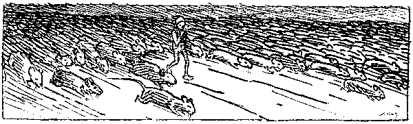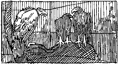 Aber er hatte eines vergessen. Er war jetzt nicht mehr so groß, daß die Hühner sich vor ihm hätten fürchten müssen. Die ganze Hühnerschar stürzte auf ihn zu, pflanzte sich um ihn herum auf und schrie: „Ga, ga, ga, gag! Es geschieht dir recht! Ga, ga, ga, gag! Es geschieht dir recht!“