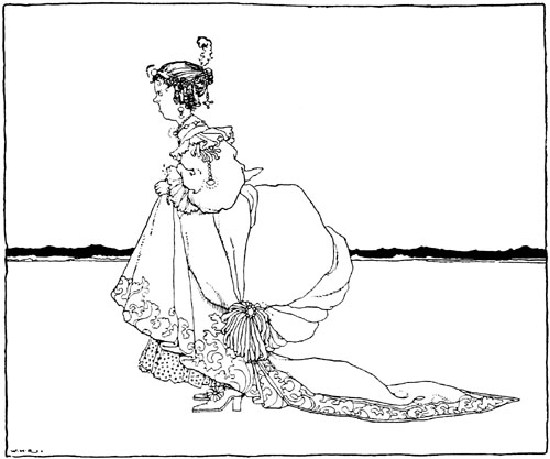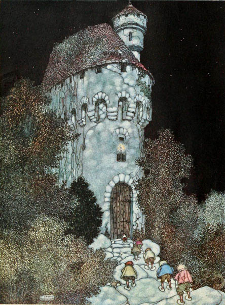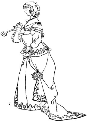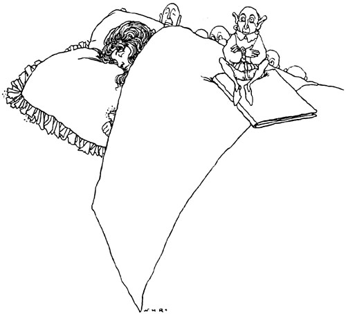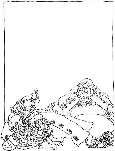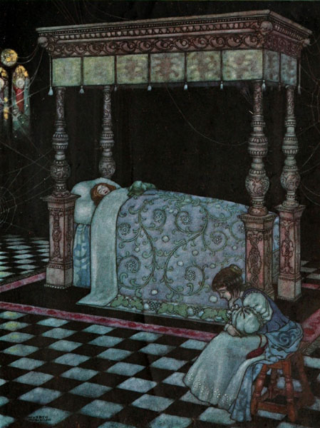 The prince made his way into a great courtyard, paved with marble, and mounting the staircase entered the guardroom. Here the guards were lined up on either side in two ranks, their muskets on their shoulders, snoring their hardest. Through several apartments crowded with ladies and gentlemen in waiting, some seated, some standing, but all asleep, he pushed on, and so came at last to a chamber which was decked all over with gold. There he encountered [p. 12] the most beautiful sight he had ever seen. Reclining upon a bed, the curtains of which on every side were drawn back, was a princess of seemingly some fifteen or sixteen summers, whose radiant beauty had an almost unearthly lustre.