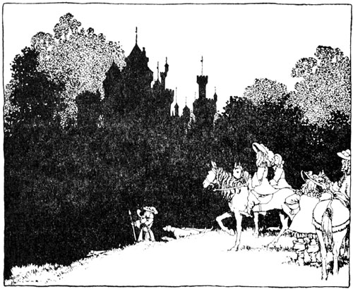 Hardly had he taken a step towards the wood when the tall trees, the brambles and the thorns, separated of themselves and made a path for him. He turned in the direction of the castle, and espied it at the end of a long avenue. This avenue he entered, and was surprised to notice that the trees closed up again as soon as he had passed, so that none of his retinue were able to follow him. A young and gallant prince is always brave, however; so he continued on his way, and presently reached a large fore-court.