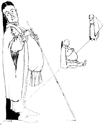 The King of the Peacocks hardly knew what to make of this bold and confident challenge. He was almost of a mind to spare their lives and let them take their sister away. But his Chancellor, an arrant flatterer, egged him on, whispering that if he did not avenge himself, he would be the laughing-stock of the whole world, and would be looked upon as a mere twopenny-halfpenny monarch. Thus influenced, [p. 193] he vowed he would not pardon them, and ordered their trial to take place.