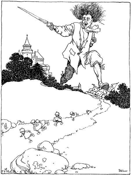The steward made no answer, being determined to trick her as he had done previously. He went in search of little Day, whom he found with a tiny foil in his hand, making brave passes—though he was but three years old—at a big [p. 18] monkey. He carried him off to his wife, who stowed him away in hiding with little Dawn. To the ogress the steward served up, in place of Day, a young kid so tender that she found it surpassingly delicious.