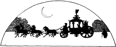A hundred carriages had been sent to the water's edge by the king. These were drawn by animals of every kind—lions, bears, stags, wolves, horses, oxen, asses, eagles, and peacocks. The carriage in which Princess Rosette was to be borne was drawn by six blue monkeys which could leap and dance upon the tight-rope and perform endless amusing antics; these had trappings of crimson velvet, studded with gold plates.