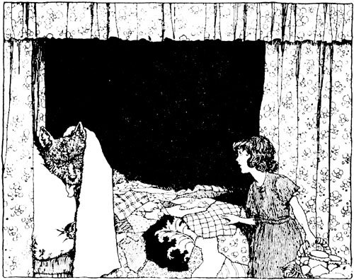 When night fell the princess went to sleep, according to her usual practice, with little Frillikin comfortably curled up at the foot of the bed, stirring not a paw. When Rosette was fast asleep the wicked nurse, who had remained awake, went to find the boatman. She took him to the cabin where the princess lay, and with the help of the foster-sister they lifted her up—feather-bed, mattress, sheets, blankets, and all—without disturbing her, and threw her into the sea just as she was. So soundly did the princess slumber that she never woke up.