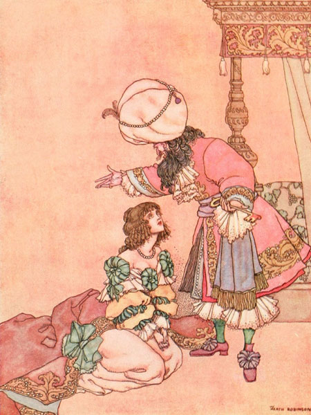 The old man saw plainly that Rosette was a great lady, for the coverlets of her bed were of gold and silver, and her mattress of satin. He begged her to tell him her story, promising not to repeat a word if she so desired. She related everything from beginning to end—not without tears, for she still believed that the King of the Peacocks had meant her to be drowned.