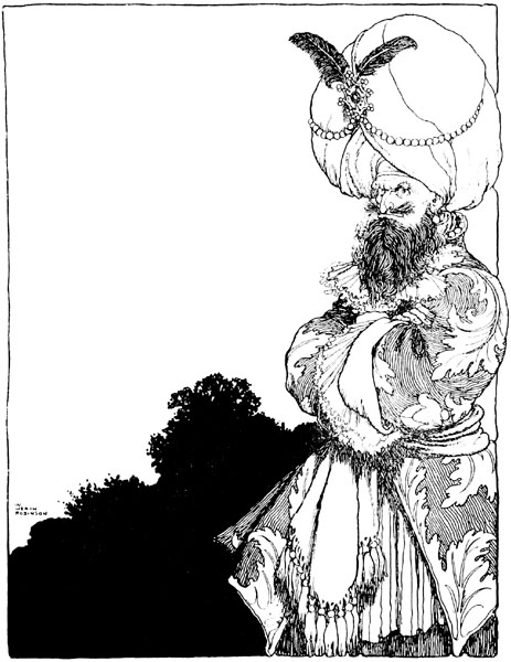 When the King of the Peacocks should have dined there was nothing in the stew-pot and nothing in the larder. Everybody gazed blankly at everybody else, and the king flew into a terrible rage. 'Oh, very good,' said he; 'it seems I am to have no dinner! Well, put the spits to the fire, and see to it that some good roast joints are ready for me this evening!'