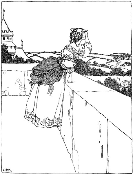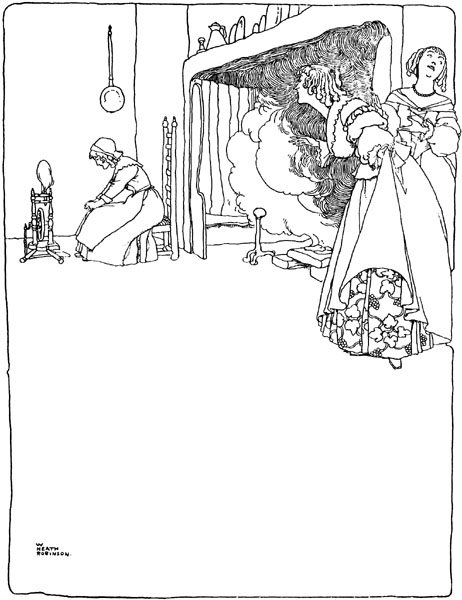 The king handed her down from her chariot, and she approved of all that he had done. But being gifted with great powers of foresight, she bethought herself that when the princess came to be awakened, she would be much distressed to find herself all alone in the old castle. And this is what she did.