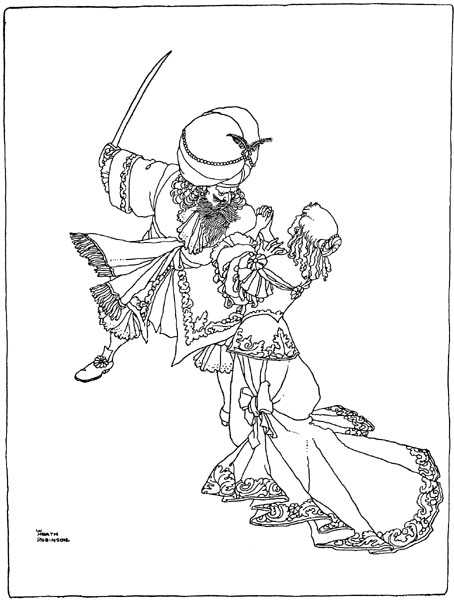 When the King of the Peacocks entered the court of justice the old man flung himself on his knees, and declared that he would narrate all that had happened. As he told his story the king eyed the beautiful princess, and was touched by her weeping. When presently the good man declared that her name was the Princess Rosette, and that she had been thrown into the sea, he bounded three times into the air, despite the weak state in which he was after going so long without food, and ran to embrace her. As [p. 199] he undid the cords which bound her he cried out that he loved her with all his heart.