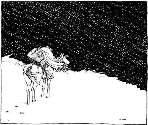 They slept but little, however. The princess, indeed, had not much need of sleep, and as soon as morning came the prince took his leave of her. He returned to the city, and told his father, who was awaiting him with some anxiety, that he had lost himself while hunting in the forest, but had obtained some black bread and cheese from a charcoal-burner, in whose hovel he had passed the night. His royal father, being of an easy-going nature, believed the tale, but his mother was not so easily hoodwinked. She noticed that he now went hunting every day, and that he always had an excuse handy when he had slept two or three [p. 16] nights from home. She felt certain, therefore, that he had some love affair.