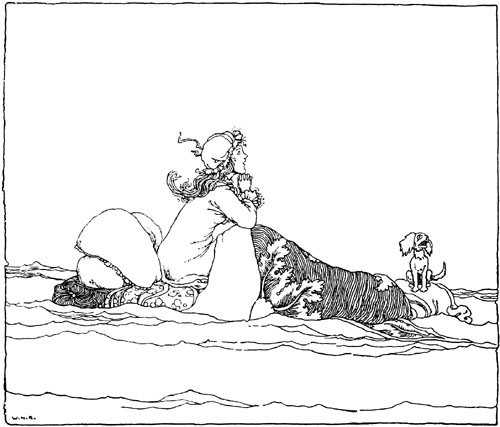 When morning came the bed was not far off the shore. Hereabouts there lived, all alone, a kindly old man. His home was a little hut where no one ever came, and as he had no desire for worldly goods he was very poor. He was astonished when he heard the barking of Frillikin, for no dogs ever came that way; and supposing that some travellers must have missed their road, he went out with the good-natured intention of putting them right. Suddenly he saw the princess and Frillikin floating out at sea. The princess caught sight of him, and stretching out her arms to him, cried: