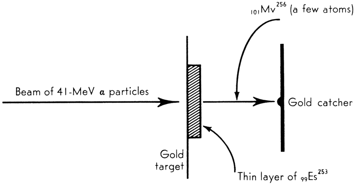| 101 | Mendelevium (Md) | 256 | 1955; A. Ghiorso, B. G. Harvey, G. R. Choppin, S. G. Thompson, G. T. Seaborg; University of California at Berkeley; 41-MeV helium-ion bombardment of Es253 in 60-inch cyclotron. |