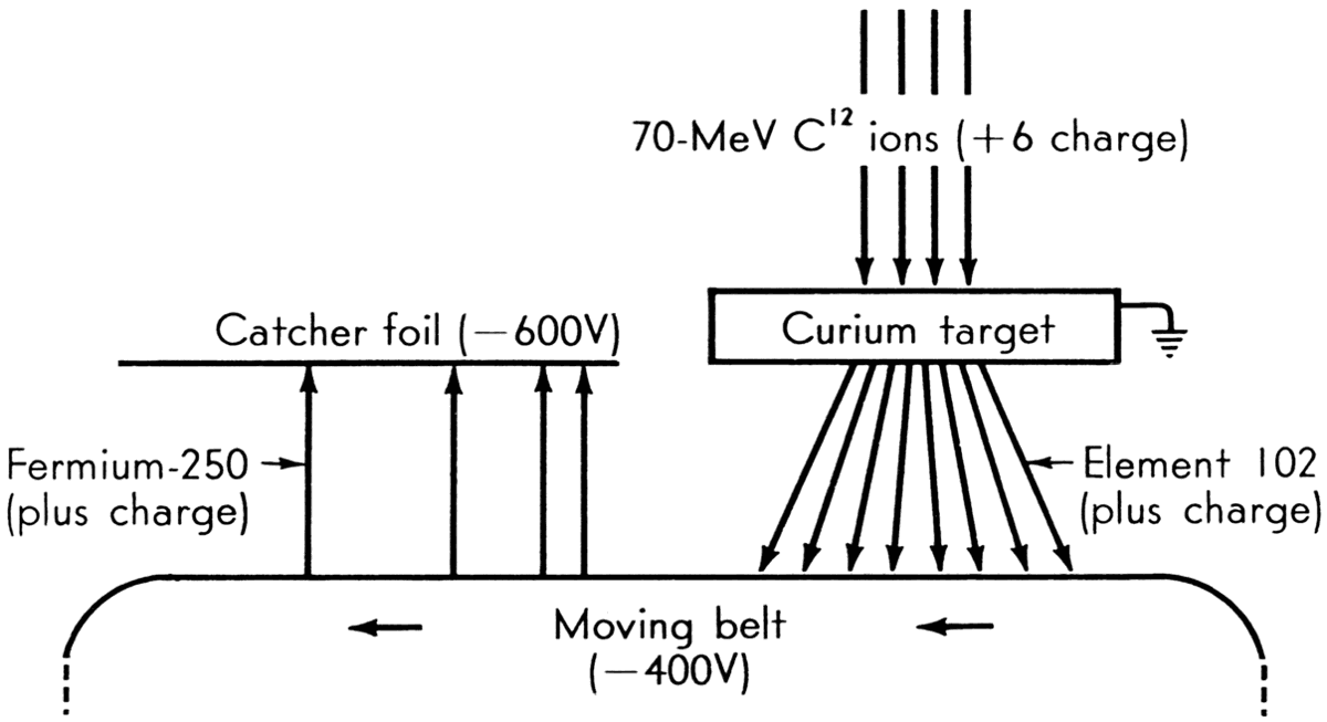 In 1957, in Stockholm, element 102 was reported found by an international team of scientists (who called it nobelium), but diligent and extensive research failed to duplicate the Stockholm findings. However, a still newer technique developed at Berkeley showed the footprints—if not the living presence—of 102 (see Fig. 4). The rare isotope curium-246 is coated on a small piece of nickel foil, enclosed in a helium-filled container, and placed in the[Pg 16] heavy-ion linear accelerator (Hilac) beam. Positively charged atoms of element 102 are knocked off the foil by the beam, which is of carbon-12 or carbon-13 nuclei, and are deposited on a negatively charged conveyor apron. But element 102 doesn't live long enough to be actually measured. As it decays, its daughter product, 100Fm250, is attracted onto a charged aluminum foil where it can be analyzed. The researchers have decided that the hen really did come first: they have the egg; therefore the hen must have existed. By measuring the time distance between target and daughter product, they figure that the hen-mother (element 102) must have a half-life of three seconds.