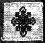 Pattern number three, a bookmark, is made like the first, except that eight strips of[Pg 38] sixteen-inch length are used and the strips woven at right and left are finished as directed for the mat. Number four is another form like this, with the long ends back and front slipped through squares to form a napkin ring. Number five is a six-inch mat made of twelve twenty-inch strips. Weave six double strips left and right into two strips and then add four to make the square. To finish the edge cut off the under one of each double strip, fold the upper one over it and then slip it under the square which comes next, cutting it off even. Strips of felt can be woven in this way for table mats or holders.