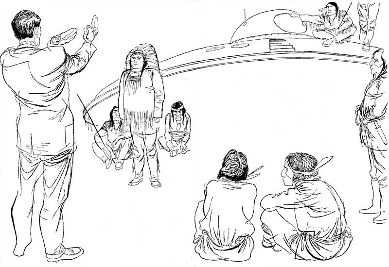 Arriving near the close of the Eighteenth Century, he found a sizeable encampment of Indians, brought the ship down among them, and summoned the chiefs to a Council of War, where he outlined to them his plan. To his astonishment he found the chiefs suspicious of outside help and confident that they could defeat the white man alone. In vain did Lo-as-ro explain that they were doomed; they could not, or would not, believe that he had visited the future. He offered to take them ahead and let them see for themselves—an offer that was quickly refused.