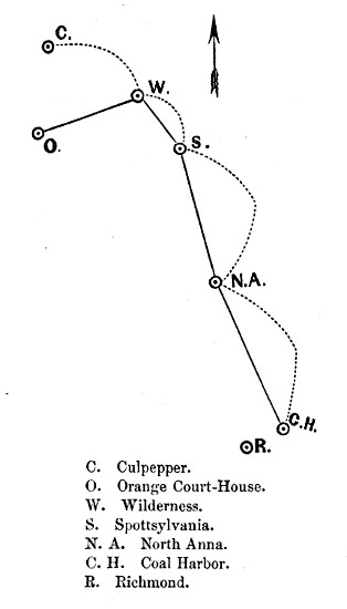 The accompanying diagram will convey to the eye the relative movements of the two armies,—General Grant moving on the arcs of the circles, as represented by the dotted lines, and Lee upon the chords of the arcs, as indicated by the continuous lines.