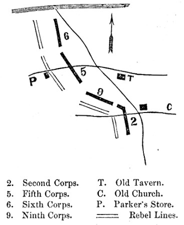 The Second Corps, which had crossed at Ely's Ford, was already on the move towards Spottsylvania. A recall was sent, also orders directing Hancock to hold the junction of the roads. The Fifth Corps was thrown out upon the turnpike towards Parker's store. The Sixth was moved up from the Germanna road, west, into the woods, and placed in position to cover all approaches to the ford. The Ninth arrived during the day, and moved into the gap between the Fifth and Second. Divisions were moved to the right, to the left, and to the centre, during the two days' fight, but the positions of the corps remained unchanged.