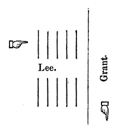 By this success Lee was compelled on Thursday night to withdraw his troops from the line he had held so tenaciously, and concentrate them in a smaller semi-circle.[Pg 131] Lee had the advantage of Johnston. It was Gettysburg reversed.