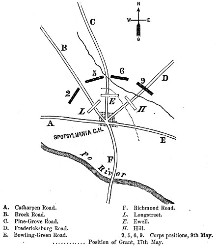 The natural defences of Spottsylvania are two small streams,—the Po and the Ny, affluents of the Mattapony. The advance of the Fifth Corps was checked, three miles west of the Court-House, by Longstreet's and Ewell's corps, which had left Wilderness on the night of the 6th. The Sixth came up at five o'clock and joined in the conflict, driving the enemy from the position he had taken on the north bank of the Ny.