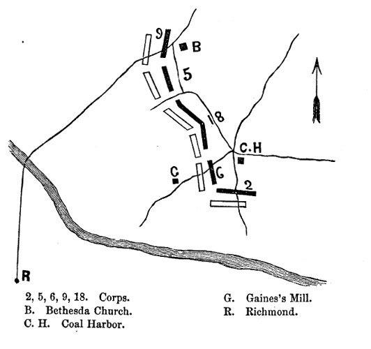 On Sunday, the 29th, there was one[Pg 132] of the severest cavalry-engagements of the war, at Hawes's shop, west of Hanover Town, where Sheridan drove the Rebels back upon Bethesda Church. The array came into position on the 30th, its right towards Hanover Court-House. Lee was already in position, and during the day there was firing all along the line. Each corps was engaged. The Second Corps by the Shelton House with a bayonet-charge pushed the enemy from the outer line of works which he had thrown up, while the Fifth Corps rolled back, with terrible slaughter, the mass of men which came upon its flank and front at Bethesda Church. At Coal Harbor, the Sixth, joined by the Eighteenth Army Corps, under Major-General W. F. Smith, from Bermuda Hundred, met Longstreet and Breckenridge and troops from Beauregard. Sheridan had seized this important point,—important because of the junction of roads,—and held it against cavalry and infantry till the arrival of the Fifth and Eighteenth. The point secured, a new line of battle was formed on the 1st of June. The Ninth held the right at Bethesda Church; the Fifth was south of the church, joining the Eighteenth; the Sixth held the road from Coal Harbor to Gaines's Mill; while the Second was thrown out on the left, on the road leading to Despatch Station and the Chickahominy, as indicated by the diagram (p. 131).