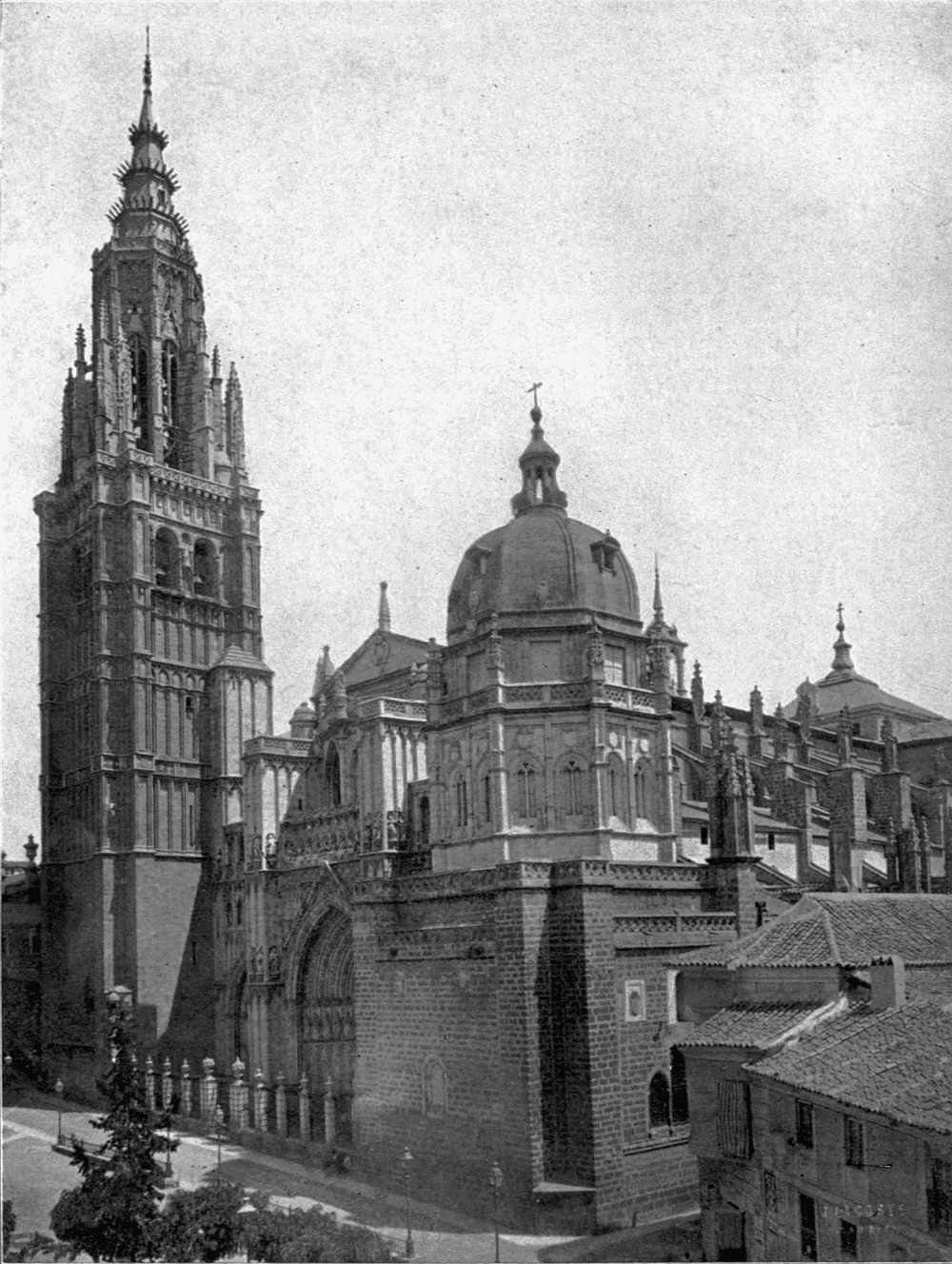 The Cathedral stands upon one of the hills of the old city. The exact date of its inception, as well as the name of the original architect, is doubtful, but it is certain that it was begun not long after the year 1100. At Jeronimo's death it could not have been{9} far advanced, but the crossing and the Capilla Mayor could be consecrated and employed for services in the middle of the century, and the first cloisters were built soon after. The nave and side aisles followed, their arches being closed in the middle of the thirteenth century. The lantern was probably placed over the crossing as late as the year 1200. Following an order inverse to that pursued by later Gothic architects, the Romanesque builders finished their work with the eastern end.