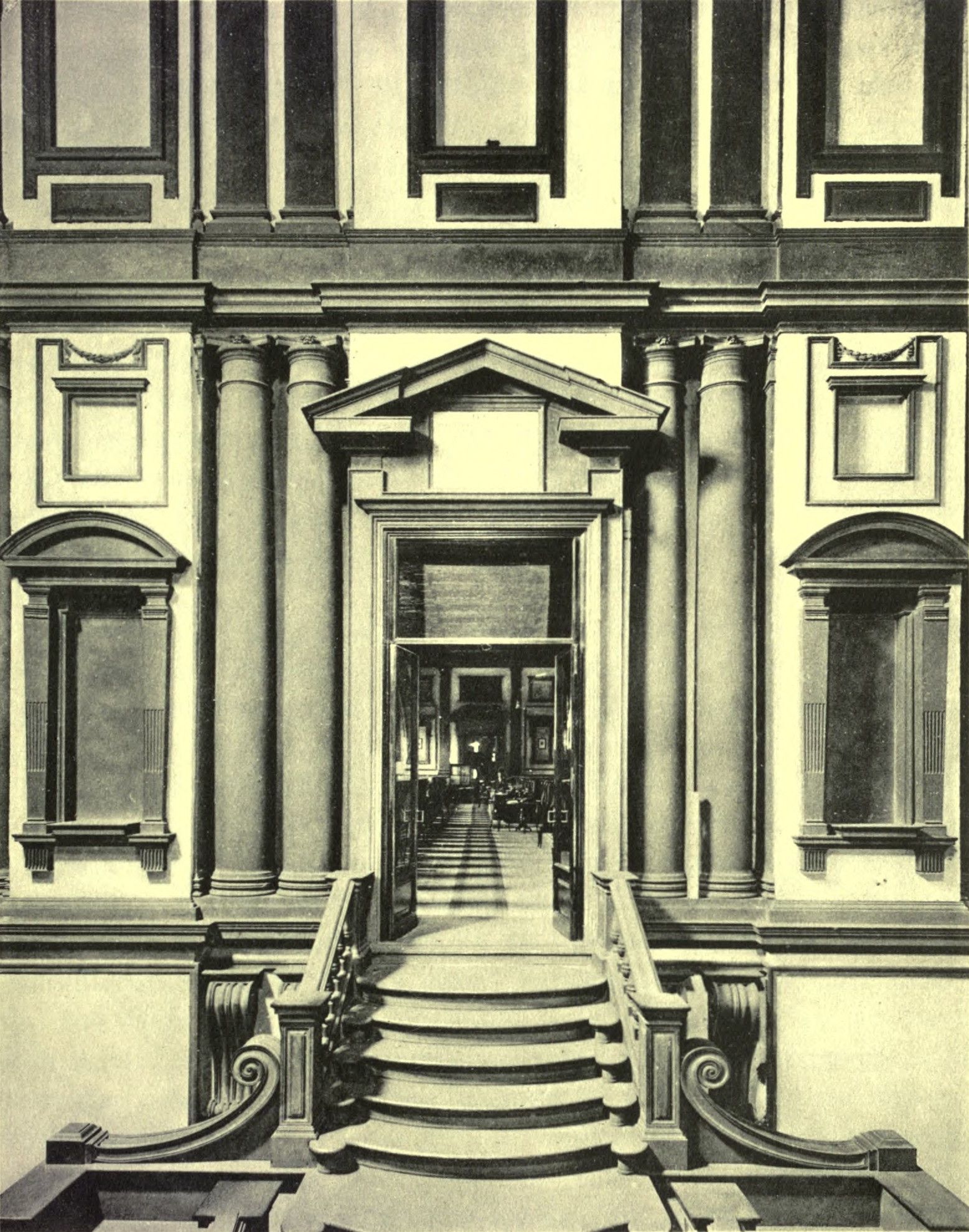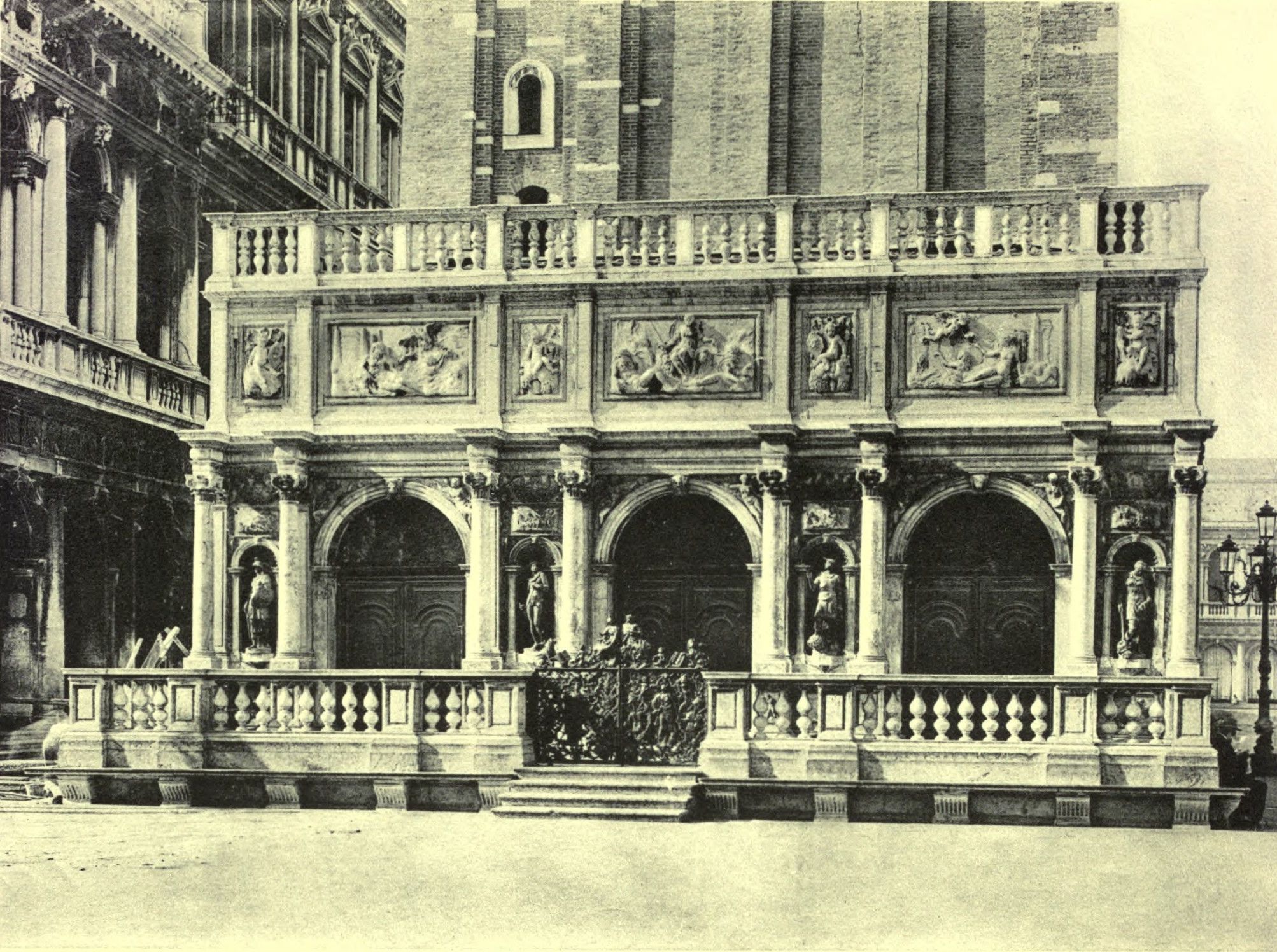Not long afterwards, by order of the Procurators, he set his hand to the very rich and beautiful building of the Library opposite to the Palazzo Pubblico, with such a variety of architecture (for it is both Doric and Corinthian), and such a wealth of carvings, cornices, columns, capitals, and half-length figures throughout the whole work, that it is a marvel; and all without any sparing of expense, since it is full of the richest pavements, stucco-work and scenes throughout the halls of that place, and public staircases adorned with various pictures, as has been related in the Life of Battista Franco, not to speak of the appurtenances and rich ornaments that it has at the principal door of entrance, which give it majesty and grandeur, demonstrating the ability of Sansovino. Which method of building was the reason that in that city, into which there had not entered up to that time any other method but that of building their houses and palaces in one and the same order, each man always continuing the same things with the same measurements and ancient use, without varying according to the sites as they found them, or according [Pg 218] to convenience; it was the reason, I say, that buildings both public and private began to be erected with new designs and better order, and according to the ancient teaching of Vitruvius; and that work, in the opinion of those who are good judges and have seen many parts of the world, is without any equal.