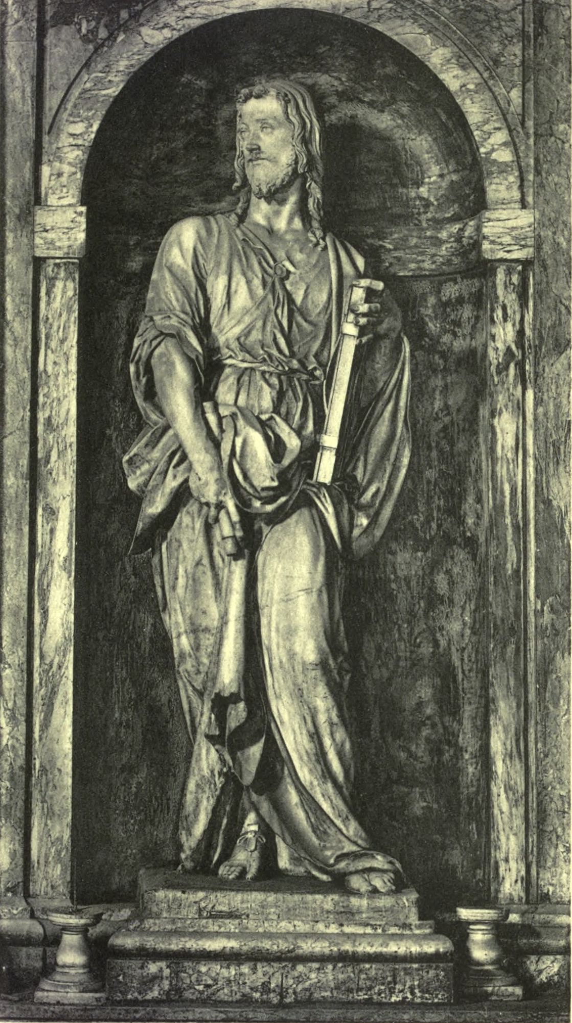 Likewise a disciple of Jacopo was Alessandro Vittoria of Trento, a most excellent sculptor and much the friend of study, who with a very beautiful manner has shown in many works that he has executed, as well in stucco as in marble, that he has a ready brain and a lovely style, and that his labours are worthy to be held in estimation. By the hand of this Alessandro, in Venice, at the principal door of the Library of S. Marco, are two great women of stone, each ten palms high, which are [Pg 205] full of grace and beauty and worthy to be much extolled. He has made four figures for the tomb of the Contarini in the Santo of Padua, two slaves, or rather, captives, with a Fame and a Thetis, all of stone; and an Angel ten feet high, a very beautiful statue, which has been placed upon the Campanile of the Duomo in Verona. And to Dalmatia he sent four Apostles also of stone, each five feet high, for the Cathedral of Traù. He made, also, some figures in silver for the Scuola of S. Giovanni Evangelista in Venice, which were all in full-relief and rich in grace, and a S. Teodoro of two feet in silver, in the round. For the Chapel of the Grimani, in S. Sebastiano, he wrought two figures in marble, each three feet high; and then he made a Pietà, with two figures of stone, held to be good, which are at S. Salvadore in Venice. He made a Mercury, held to be a good figure, for the pulpit of the Palazzo di S. Marco, which looks out over the Piazza; and for S. Francesco della Vigna he made three figures large as life—S. Anthony, S. Sebastian, and S. Rocco—all of stone and full of beauty and grace, and well wrought. For the Church of the Crocicchieri he made in stucco two figures each six feet high, very beautiful, which are placed on the high-altar; and of the same material he made, as has been already told, all the ornaments that are in the vaulting of the new staircase of the Palazzo di S. Marco, with various patterns of compartments in stucco, where Battista Franco afterwards painted in the spaces the scenes, figures, and grotesques that are there. In like manner, Alessandro executed the ornaments of the staircase of the Library of S. Marco, all works of great mastery; and a chapel for the Friars Minors, and in the altar-piece of marble, which is very large and very beautiful, the Assumption of Our Lady in half-relief, with five great figures at the foot which have in them something of the grand and are made with a beautiful manner, a lovely and dignified flow of draperies, and much diligence of execution; which figures of marble—S. Jerome, S. John the Baptist, S. Peter, S. Andrew, and S. Leonardo—each six feet high, are the best of all the works that he has done up to the present. And as a crown to that chapel, on the frontispiece, are two figures likewise of marble, each eight feet high and very graceful. The same Vittoria has executed many portraits in marble and most beautiful heads, [Pg 206] which are good likenesses, such as that of Signor Giovan Battista Feredo, placed in the Church of S. Stefano, that of Camillo Trevisano, the orator, placed in the Church of SS. Giovanni e Polo; the most illustrious Marc'Antonio Grimani, likewise placed in the Church of S. Sebastiano; and in S. Gimignano, the rector of that church. He has also portrayed Messer Andrea Loredano. M. Priano da Lagie, and two brothers of the Pellegrini family—M. Vincenzio and M. Giovan Battista—both orators. And since Vittoria is young and a willing worker, talented, amiable, desirous of acquiring name and fame, and, lastly, very gentle, we may believe that if he lives, we are destined to see most beautiful works come from him from day to day, worthy of his name of Vittoria, and that, if his life endures, he is like to be a most excellent sculptor and to win the palm from all the others of that country.
