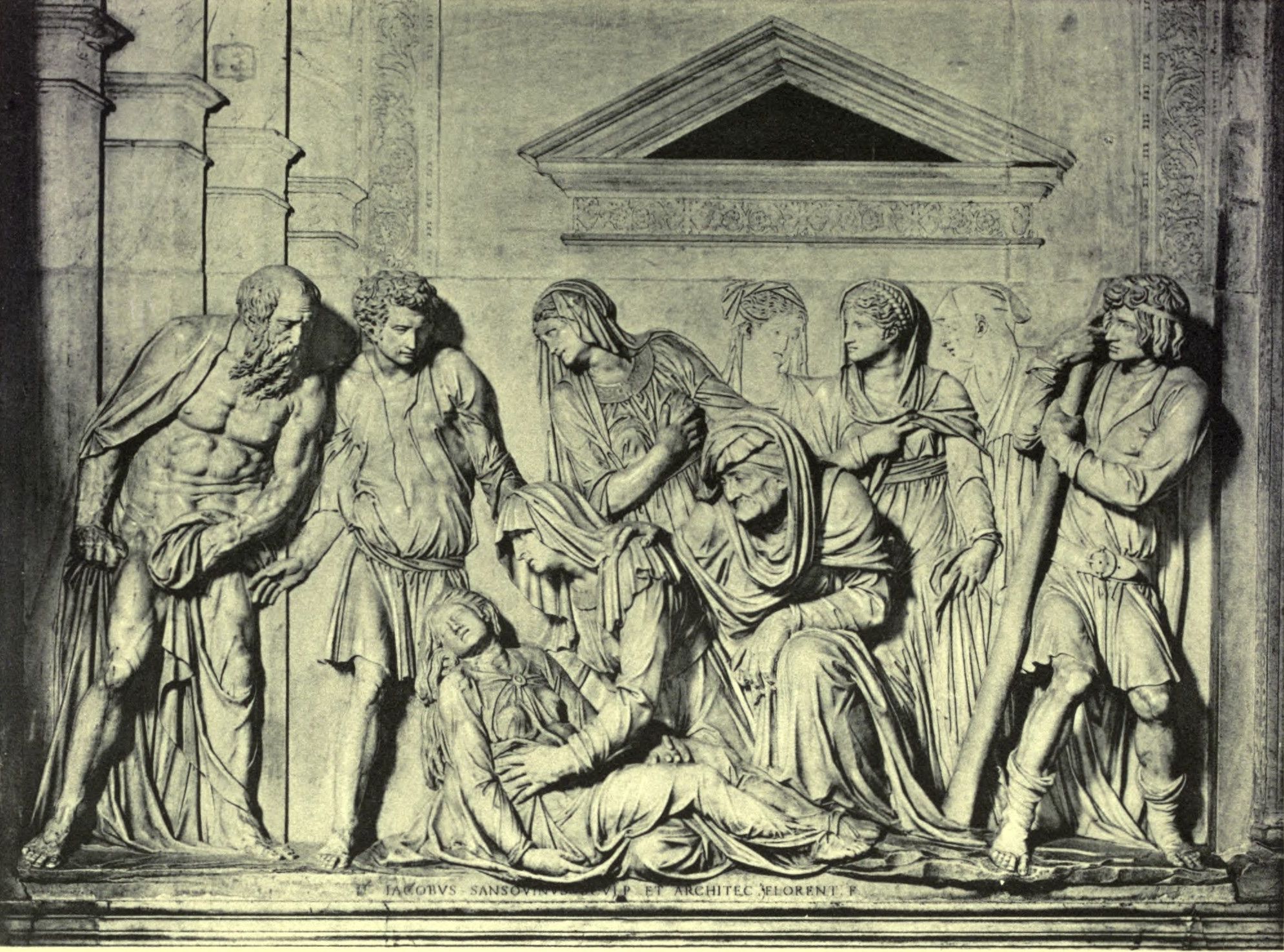 JACOBO SANSOVINO FLORENTINO QUI ROMÆ JULIO II, LEONI X, CLEMENTI VII, PONT. MAX., MAXIME GRATUS, VENETIIS ARCHITECTURÆ SCULPTURÆQUE INTERMORTUUM DECUS PRIMUS EXCITAVIT, QUIQUE A SENATU OB EXIMIAM VIRTUTEM LIBERALITER HONESTATUS, SUMMO CIVITATIS MŒRORE DECESSIT, FRANCISCUS F. HOC MON. P. VIXIT ANN. XCIII. OB. V. CAL. DEC. MDLXX.