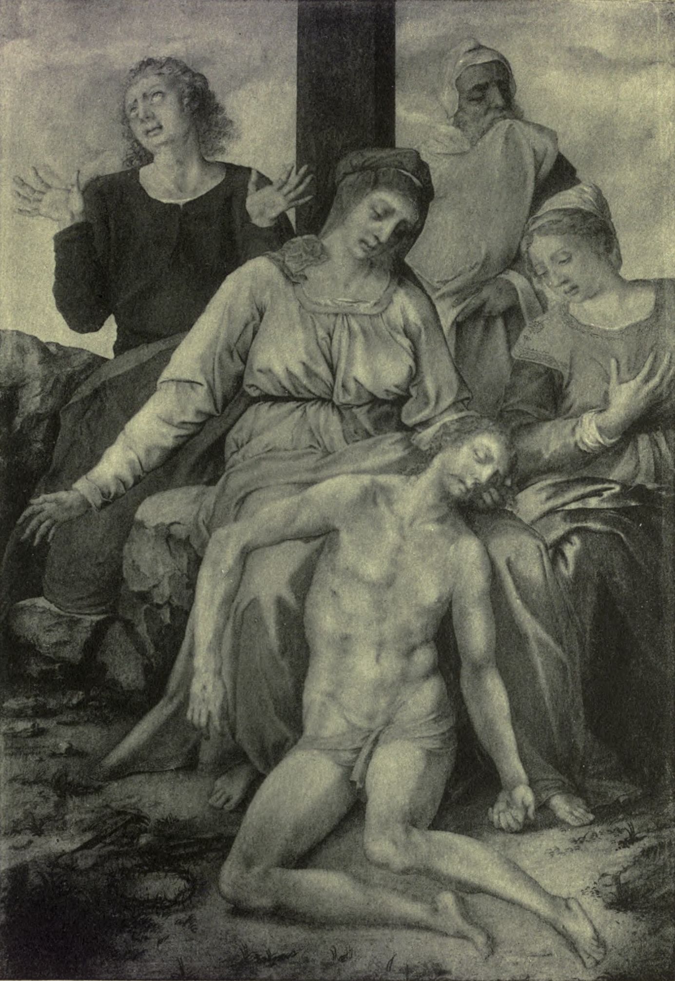 Many years ago Don Giulio stayed many months with Duke Cosimo, and during that time executed some works for him, part of which were sent to the Emperor and other lords, and part remained with his most illustrious Excellency, who, among other things, caused him to copy a little head of Christ from one of great antiquity that his Excellency himself possesses, which once belonged to Godfrey of Bouillon, King of Jerusalem; which head, they say, is more like the true image of the Saviour than any other that there may be. Don Giulio painted for the said Lord Duke a Christ on the Cross with the Magdalene at the foot, which is a marvellous thing, and a little picture of a Pietà, of which we have the design in our book together with another, also by the hand of Don Giulio, of Our Lady standing with her Son in her arms, dressed in the Jewish manner, with a choir of Angels about her, and many nude souls in the act of commending themselves to her. But to return to the Lord Duke; he has always loved dearly the excellence of Don Giulio, and sought to obtain works by his hand; and if it had not been for the regard that he felt for Farnese, he would not have let him go when he stayed some months, as I have said, in his service in Florence. The Duke, then, besides the works mentioned, has a little picture by the hand of Don Giulio, wherein is Ganymede borne to Heaven by Jove transformed into an Eagle, copied from the one that Michelagnolo once drew, which is now in the possession of Tommaso de' Cavalieri, as has been [Pg 252] told elsewhere. In like manner, the Duke has in his study a S. John the Baptist seated upon a rock, and some portraits by the same hand, which are admirable.