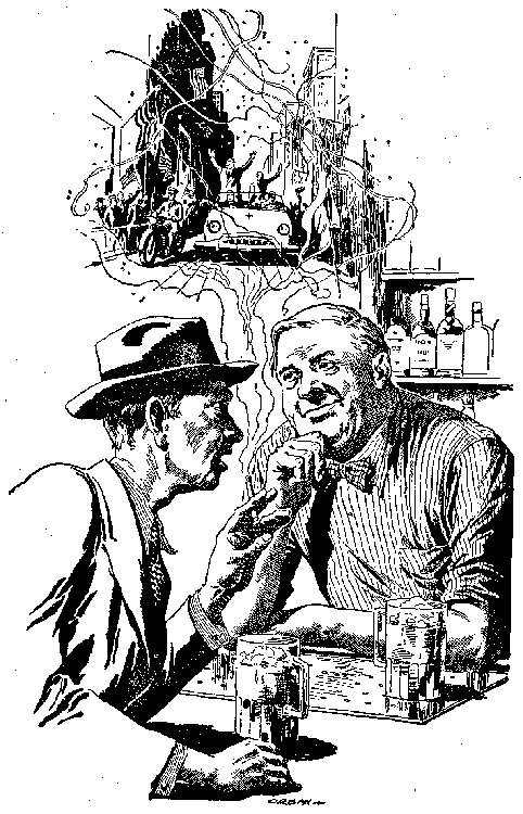 The first time this little guy comes in I'm new on the job. He looks around as if he's scared a prohibition agent will pop out of the walls and bite him. Then he gets up his nerve and sidles to the bar. His voice is as thin as the rest of him.