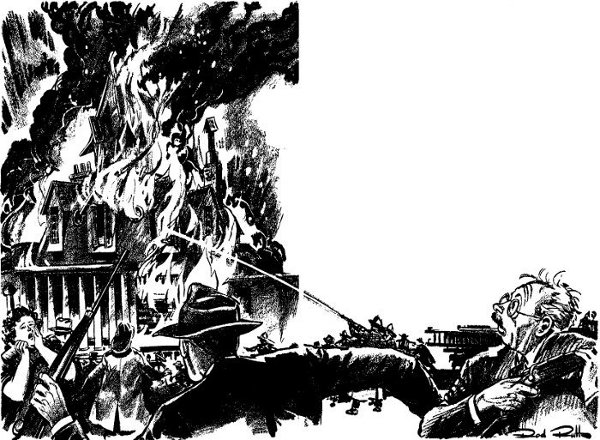 This little guy Stoddard was one of the toughest customers I'd ever done business with. To look at him you'd think he was typical of the mild pleasant little sort of suburban home owner who caught the eight-oh-two six days a week and watered the lawn on the seventh. Physically, his appearance was completely that of the inconspicuous average citizen. Baldish, fortiesh, bespectacled, with the usual behind-the-desk bay window that most office workers get at his age, he looked like nothing more than the amiable citizen you see in comic cartoons on suburban life.