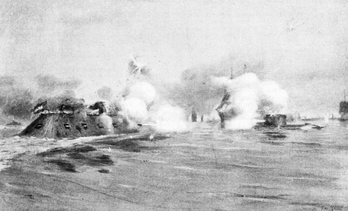 Early the following morning the Merrimac again steamed forth to take up the work she had so well begun, and to destroy the Union fleet. She steered straight for the Minnesota; but when she was almost there, to her astonishment a strange-looking little craft advanced from the side of the big wooden frigate and boldly barred the Merrimac's path. For a moment the Confederates could hardly believe their eyes. The Monitor was tiny compared to their ship, for she was not one-fifth the size, and her queer construction and odd look made them look at their new foe with contempt; but the first shock of battle did away with this feeling. The Merrimac turned on her foe her rifle guns, intending to blow her out of the water, but the shot glanced from the thick iron turret of the Monitor. Then the Monitor's guns opened fire, and as the great balls struck the sides of the ram the plates started and her timbers gave. Had the Monitor been such a vessel as those of her type produced later in the war the ram would have been sunk then and there; but as it was her shot was not quite heavy enough to pierce the iron walls. Around and around the two strange combatants hovered, their guns bellowing without cessation, while the men on the frigates and on shore watched the result with breathless interest. Neither the Merrimac nor the Monitor could dispose of its antagonist. The ram's guns could not damage the turret, and the Monitor was able to dexterously avoid the stroke of the formidable prow. On the other hand, the shot of the Monitor could not penetrate the Merrimac's tough sides. Accordingly, fierce though the struggle was, and much though there was that hinged on it, it was not bloody in character. The Merrimac could neither destroy nor evade the Monitor. She could not sink her when she tried to, and[Pg 499] when she abandoned her and turned to attack one of the other wooden vessels the little turreted ship was thrown across her path, so that the fight had to be renewed. Both sides grew thoroughly exhausted, and finally the battle ceased by mutual consent. Nothing more could be done. The ram was badly damaged, and there was no help for her save to put back to the port whence she had come. Twice afterwards she came out, but neither time did she come near enough to the Monitor to attack her, and the latter could not move off where she would cease to protect the wooden ships. Tactically it was a drawn battle, neither ship being able to damage the other, and both ships being fought to a standstill; but the moral and material effects were wholly in favor of the Monitor. Her victory was hailed with exultant joy throughout the whole Union, and exercised a correspondingly depressing effect in the Confederacy, while every naval man throughout the world who possessed eyes to see saw that the fight in Hampton Roads had inaugurated a new era in ocean warfare, and that the Monitor and Merrimac, which had waged so gallant and so terrible a battle, were the first ships of the new era, and that as such their names would be forever famous.