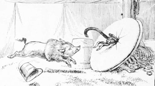 "Oh me! Oh my! How we blacked the Tiger's eye!" The colors are red and blue.
