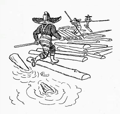 Paul's fast foot work made him a "good man on the round stuff" and in spite of his weight he had no trouble running around on the floating logs, even the small ones. It was said that Paul could spin a log till the bark came off and then run ashore on the bubbles. He once threw a peavy handle into the Mississippi at St. Louis and standing on it, poled up to Brainerd, Minnesota. Paul was a "white water bucko" and rode water so rough it would tear an ordinary man in two to drink out of the river.