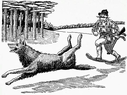 Sport, the reversible dog, was really the best hunter. He was part wolf and part elephant hound and was raised on bear milk. One night when Sport was quite young, he was playing around in the horse barn and Paul, mistaking him for a mouse, threw a hand axe at him. The axe cut the dog in two but Paul, instantly realizing what had happened, quickly stuck the two halves together, gave the pup first aid and bandaged him up. With careful nursing the dog soon recovered and then it was seen that Paul in his haste had twisted the two halves so that the hind legs pointed straight up. This proved to be an advantage for the dog learned to run on one pair of legs for a while and then flop over without loss of speed and run on the other pair. Because of this he never tired and anything he started after got caught. Sport never got his full growth. While still a pup he broke through four feet of ice on Lake Superior and was drowned.